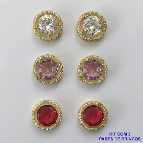 BRINCO NO BRUTO PRONTO PARA O BANHO - KIT COM 3 BRINCOS DE PINO COM BASES EM ALTA FUSÃO REDONDAS CRAVEJADAS COM MICROS ZIRCÔNIAS CRISTAIS E PEDRAS EM ZIRCÔNIAS 10MM - PESO TOTAL 16,4GR BRU15877