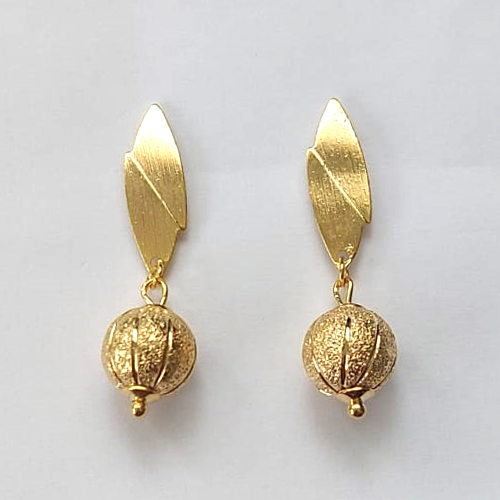 BRINCO FOLHEADO A OURO - BANHADO COM 5 MILÉSIMOS + VERNIZ DIAMOND - BRINCO DE PINO COM BASE FOLHA E PINGENTE ESFERA COM BRILHOS 10MM - OURO431