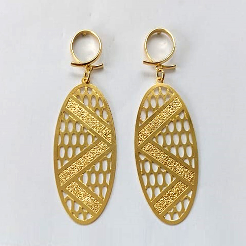 BRINCO FOLHEADO A OURO - BANHADO COM 5 MILÉSIMOS + VERNIZ DIAMOND - BRINCO DE PINO BASE VAZADA E PINGENTE FOLHA 18X47MM - OURO450