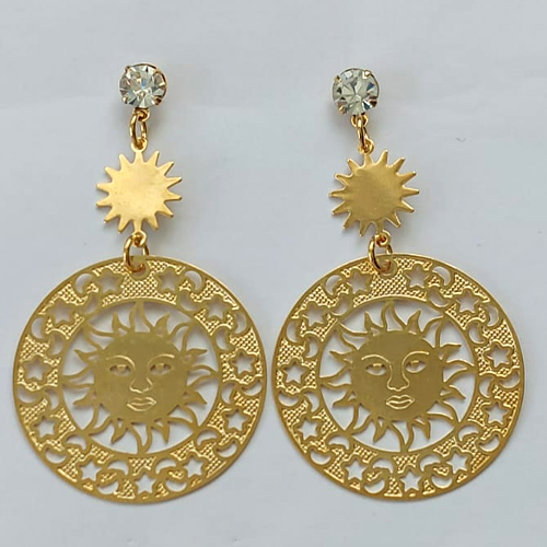 BRINCO FOLHEADO A OURO - BANHADO COM 5 MILÉSIMOS + VERNIZ DIAMOND - BRINCO DE PINO BASE COM ZIRCÔNIA E PINGENTE SOL VAZADO 57MM - OURO369