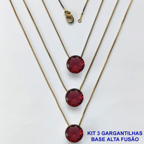 GARGANTILHA NO BRUTO PRONTA PARA O BANHO - KIT COM 3 GARGANTILHAS COM CORRENTES VENEZIANAS 45CM COM BASES EM ALTA FUSÃO E PINGENTES EM ZIRCÔNIAS REDONDAS VERMELHA 10X10CM - PESO TOTAL 9,1GR - BRU16168