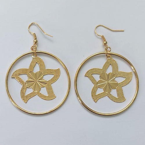BRINCO FOLHEADO A OURO - BANHADO COM 5 MILÉSIMOS + VERNIZ DIAMOND - BRINCO ANZOL COM PINGENTE FLOR GRANDE VAZADA 42MM - OURO408