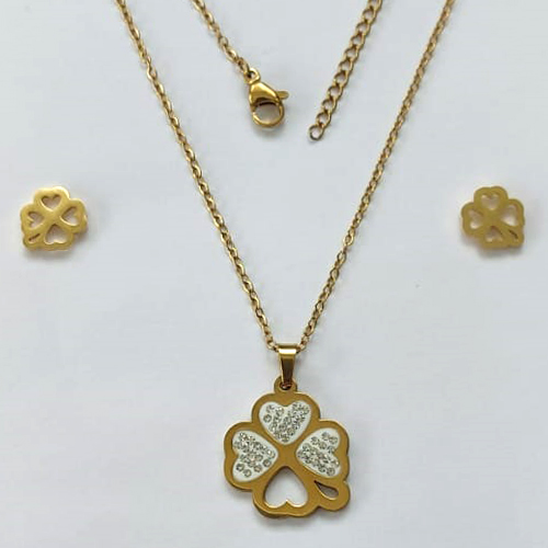 CONJUNTO EM AÇO INOXIDÁVEL - CONJUNTO EM AÇO DOURADO COM CORRENTE 45CM + EXTENSOR COM PINGENTE TREVO COM STRASS 19MM E BRINCOS TREVO VAZADO 9MM - COMPOSIÇÃO: AÇO INOXIDÁVEL DOURADO - AÇO2221