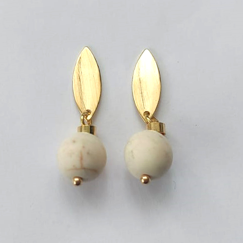BRINCO FOLHEADO A OURO - BANHADO COM 5 MILÉSIMOS + VERNIZ DIAMOND - BRINCO DE PINO BASE OVAL E PINGENTE PEDRA HOWLITA BRANCA 10MM - OURO598