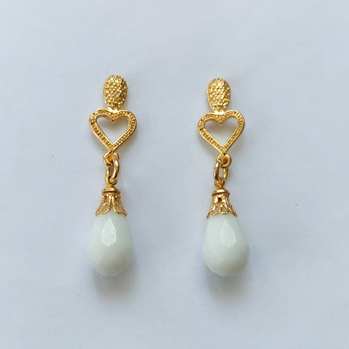 BRINCO FOLHEADO A OURO - BANHADO COM 5 MILÉSIMOS + VERNIZ DIAMOND - BRINCO DE PINO COM BASE CORAÇÃO VAZADO E PINGENTE CRISTAL LEITOSO 19MM - OURO513