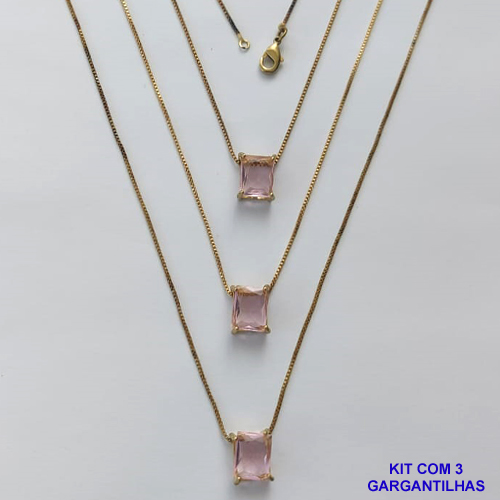 GARGANTILHA NO BRUTO PRONTA PARA O BANHO - KIT COM 3 GARGANTILHAS COM CORRENTES VENEZIANA 45CM E PINGENTE EM ZIRCÔNIA ROSA RETANGULAR 8X10CM - PESO TOTAL 10,5GR - BRU15488