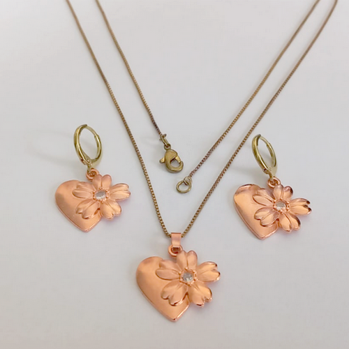 CONJUNTO NO BRUTO BRINCO ARGOLINHA DE PRESSÃO E CORRENTE VENEZIANA DE 45CM - PRONTO PARA O BANHO(CRIS)- (CX.152) - FLOR E UM CORAÇÃO DE 18MM COM UMA PEDRA ZIRCONIA - ( PESO 6,3GR - BRU24200