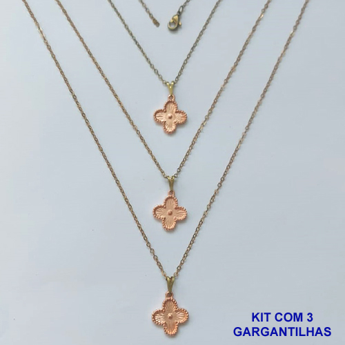GARGANTILHA NO BRUTO PRONTA PARA O BANHO - KIT COM 3 CORRENTES CADEADOS 45CM E PINGENTES TIPO VAN CLEEF 15MM - PESO TOTAL 7,3GR - BRU16195