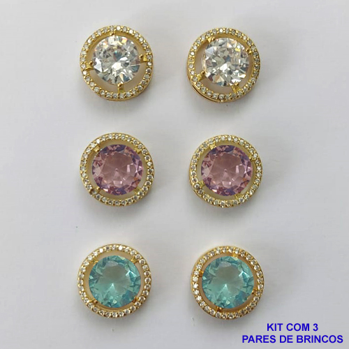 BRINCO NO BRUTO PRONTO PARA O BANHO - KIT COM 3 BRINCOS DE PINO COM BASES EM ALTA FUSÃO REDONDAS CRAVEJADAS COM MICROS ZIRCÔNIAS CRISTAIS E PEDRAS EM ZIRCÔNIAS 10MM - PESO TOTAL 16,4GR BRU15876