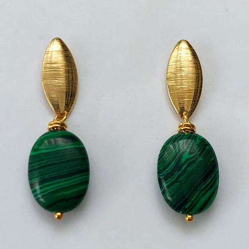 BRINCO FOLHEADO A OURO - BANHADO COM 5 MILÉSIMOS + VERNIZ DIAMOND - BRINCO DE PINO COM BASE FOLHA E PEDRA NATURAL 20MM - OURO394