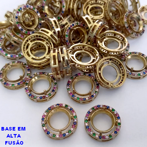 ACESSORIO NO BRUTO PRONTO PARA O BANHO) VENDIDO POR UNIDADE/ BASE PARA PINGENTE EM ALTA FUSÃO TODA CRAVEJADA EM MICRO ZIRCONIAS COLORIDAS / BASE PARA ZIRCONIA DE 10X10MM REDONDA - PESO 1.4GR - BRU3842