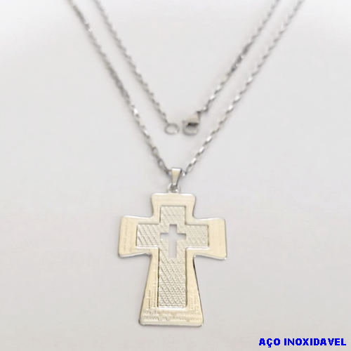 GARGANTILHA EM AÇO INOXIDAVEL COM *(CORRENTE CARTIER CURTA 50CM)* E FECHO LAGOSTA-(BCOL026)AC INOX CRUZ G C/ CRUZ VZ PAI NOSSO BORDA(C3.1004 )- AÇO0280