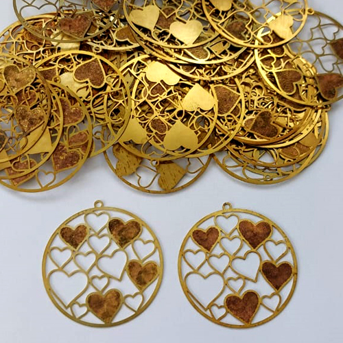 ACESSÓRIO NO BRUTO PRONTO PARA O BANHO - (47) PINGENTE REDONDO COM CORAÇÕES VAZADOS EM FOTOCORROSÃO 41MM - COMPOSIÇÃO: 100% LATÃO - PESO: 1,6GR - BRU0003410