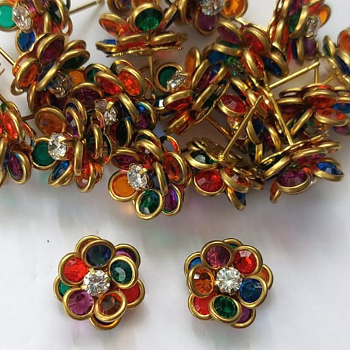 BRINCO NO BRUTO PRONTO PARA O BANHO - BRINCO DE PINO FLOR CRAVEJADA EM ZIRCÔNIAS COLORIDAS 14MM - PESO TOTAL 3GR - COMPOSIÇÃO: LATÃO / ZIRCÔNIA - BRU16122