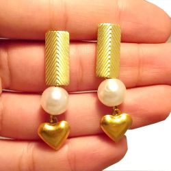 Brinco No Bruto Pronto Para Banho Com Perola De 10mm E Corações Tamanho Aproximado: 4,5cm Peso: 3,0 gramas REF: BRU1949