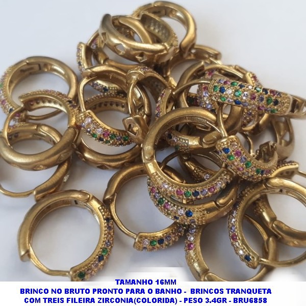 BRINCO NO BRUTO PRONTO PARA O BANHO - BRINCOS TRANQUETA COM TREIS FILEIRA ZIRCONIA(COLORIDA) - PESO 3.4GR - BRU6858