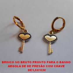 BRINCO NO BRUTO PRONTO PARA O BANHO ARGOLA DE DE PRESÃO COM CHAVE DE15X1CM PESO 2GR - BRU1166 O que são Brutos? São peças que ainda não receberam banho de metais preciosos (ouro prata entre outros¦) em sua superficie. As peças podem ser em latão baixa fusão alta fusão zamak etc¦ Peças em Bruto são impróprias para o uso pois ainda não passaram pelo processo galvanoplastico e o contato da peça bruta com a pele pode causar alergias e problemas para a saúde. Lojas que vendem o Bruto trabalham no atacado a pronta entrega e por pedidos. Depois de comprar estas peças entre em contato com uma Empresa de Galvanoplastia para banha-las¦
