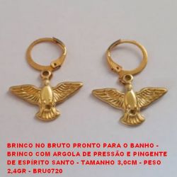 BRINCO NO BRUTO PRONTO PARA O BANHO - BRINCO COM ARGOLA DE PRESSÃO E PINGENTE DE ESPÃRITO SANTO - TAMANHO 30CM - PESO 24GR - BRU0720 O que são Brutos? São peças que ainda não receberam banho de metais preciosos (ouro prata entre outros¦) em sua superficie. As peças podem ser em latão baixa fusão alta fusão zamak etc¦ Peças em Bruto são improprias para o uso pois ainda não passaram pelo processo galvanoplastico e o contato da peça bruta com a pele pode causar alergias e problemas para a saúde. Lojas que vendem o Bruto trabalham no atacado a pronta entrega e por pedidos. Depois de comprar estas peças entre em contato com uma Empresa de Galvanoplastia para banha-las¦
