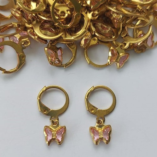 BRINCO NO BRUTO PRONTO PARA O BANHO - BRINCO ARGOLINHA DE PRESSÃO BORBOLETA EM VIDRO ROSA 8MM - PESO: 0,8GR - BRU15538