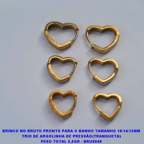 BRINCO NO BRUTO PRONTO PARA O BANHO TAMANHO 16/14/12MM TRIO DE CORAÇÃO DE PRESSÃO(TRANQUETA) PESO TOTAL 5,5GR - BRU6949