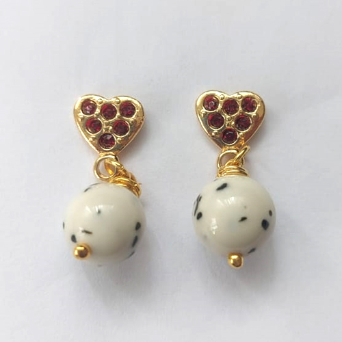 BRINCO FOLHEADO A OURO - BANHADO COM 5 MILÉSIMOS + VERNIZ DIAMOND - BRINCO DE PINO BASE CORAÇÃO COM ZIRCÔNIAS E PEDRA NATURAL JASPE DALMATA 10MM - OURO746