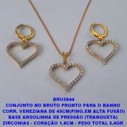 CONJUNTO NO BRUTO PRONTO PARA O BANHO CORR. VENEZIANA DE 45CM(PING.EM ALTA FUSÃO) BASE ARGOLINHA DE PRESSÃO (TRANQUETA) ZIRCONIAS - CORAÃÃO 1.8CM - PESO TOTAL 5.4GR BRU5844 O que são Brutos? São peças que ainda não receberam banho de metais preciosos (ouro prata entre outros¦) em sua superficie. As peças podem ser em latão baixa fusão alta fusão zamak etc¦ Peças em Bruto são impróprias para o uso pois ainda não passaram pelo processo galvanoplastico e o contato da peça bruta com a pele pode causar alergias e problemas para a saúde. Lojas que vendem o Bruto trabalham no atacado a pronta entrega e por pedidos. Depois de comprar estas peças entre em contato com uma Empresa de Galvanoplastia para banha-las¦