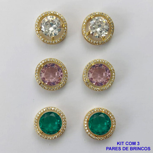BRINCO NO BRUTO PRONTO PARA O BANHO - KIT COM 3 BRINCOS DE PINO COM BASES EM ALTA FUSÃO REDONDAS CRAVEJADAS COM MICROS ZIRCÔNIAS CRISTAIS E PEDRAS EM ZIRCÔNIAS 10MM - PESO TOTAL 16,4GR BRU15880