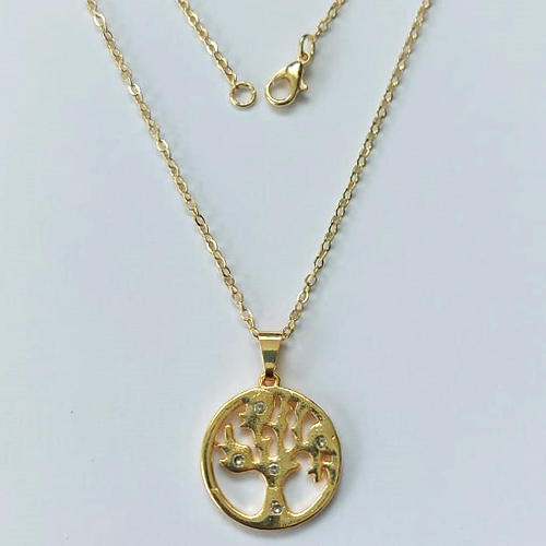 GARGANTILHA FOLHEADA A OURO 5 MILÉSIMOS + VERNIZ DIAMOND - CORRENTE CADEADO 45CM E PINGENTE REDONDO ÁRVORE DA VIDA COM ZIRCÔNIAS 19MM - OURO828