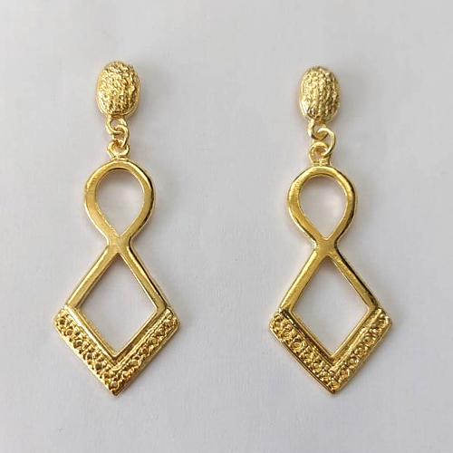 BRINCO FOLHEADO A OURO - BANHADO COM 5 MILÉSIMOS + VERNIZ DIAMOND - BRINCO DE PINO BASE REDONDA E PINGENTE GEOMÉTRICO COM DETALHES VAZADOS 19X42MM - OURO748