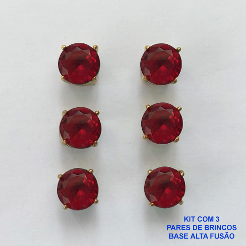 BRINCO NO BRUTO PRONTO PARA O BANHO - KIT COM 3 BRINCOS DE PINO COM BASE EM ALTA FUSÃO E COM ZIRCÔNIA VERMELHA REDONDA 8X8MM - PESO TOTAL 6,8GR - BRU15942