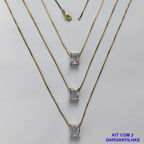 GARGANTILHA NO BRUTO PRONTA PARA O BANHO - KIT COM 3 GARGANTILHAS COM CORRENTES VENEZIANA 45CM E PINGENTE EM ZIRCÔNIA CRISTAL RETANGULAR 8X10CM - PESO TOTAL 10,5GR - BRU15486