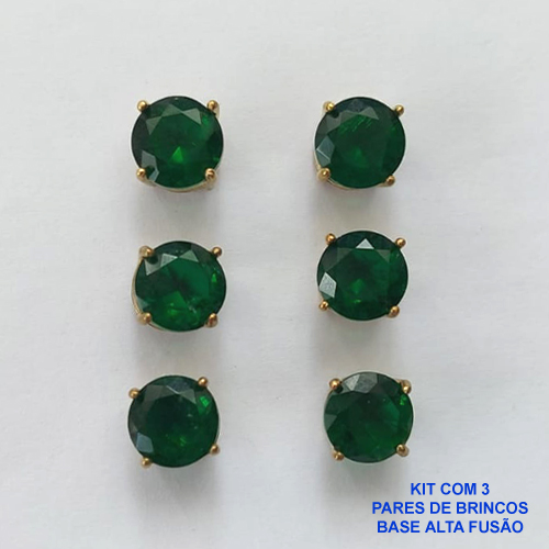 BRINCO NO BRUTO PRONTO PARA O BANHO - KIT COM 3 BRINCOS DE PINO COM BASE EM ALTA FUSÃO E COM ZIRCÔNIA VERDE ESCURA REDONDA 8X8MM - PESO TOTAL 6,8GR - BRU15945