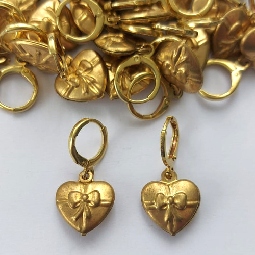 BRINCO NO BRUTO PRONTO PARA O BANHO - (E1222) BRINCO ARGOLINHA DE PRESSÃO COM PINGENTE CORAÇÃO DUPLO COM LAÇO 15MM - PESO: 2,5GR - COMPOSIÇÃO: 100% LATÃO - BRU15645