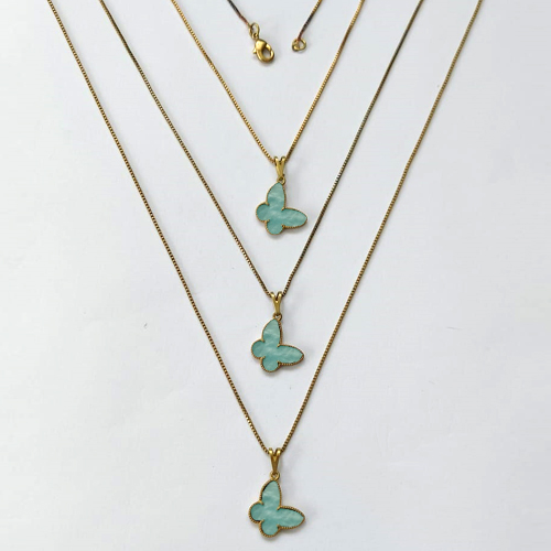 GARGANTILHA NO BRUTO PRONTA PARA O BANHO - KIT COM 3 CORRENTES VENEZIANAS 45CM E PINGENTES BORBOLETAS EM RESINA AZUL CLARA 14MM - PESO TOTAL 5,8GR - BRU16322