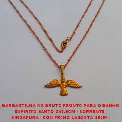 GARGANTILHA NO BRUTO PRONTO PARA O BANHO ESPIRITO SANTO 2X15CM - CORRENTE SINGAPURA - CON FECHO LAGOSTA 45CM - PESO 21GR -BRU2171 O que são Brutos? São peças que ainda não receberam banho de metais preciosos (ouro prata entre outros¦) em sua superficie. As peças podem ser em latão baixa fusão alta fusão zamak etc¦ Peças em Bruto são impróprias para o uso pois ainda não passaram pelo processo galvanoplastico e o contato da peça bruta com a pele pode causar alergias e problemas para a saúde. Lojas que vendem o Bruto trabalham no atacado a pronta entrega e por pedidos. Depois de comprar estas peças entre em contato com uma Empresa de Galvanoplastia para banha-las¦