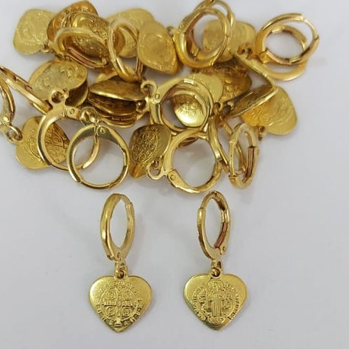 BRINCO NO BRUTO PRONTO PARA O BANHO - BRINCO ARGOLINHA DE PRESSÃO (TRANQUETA) (4012) COM PINGENTE CORAÇÃO SÃO BENTO 10MM - PESO TOTAL 1,8GR - COMPOSIÇÃO: 100% LATÃO - BRU0003661