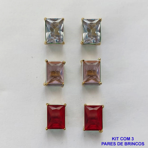 BRINCO NO BRUTO PRONTO PARA O BANHO - KIT COM 3 BRINCOS DE PINO COM ZIRCÔNIA RETANGULAR 6X8MM - PESO TOTAL 4,3GR - BRU15774