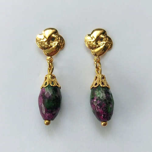 BRINCO FOLHEADO A OURO - BANHADO COM 5 MILÉSIMOS + VERNIZ DIAMOND - BRINCO DE PINO BASE FLOR E PINGENTE PEDRA RUBI ZIOSITE 12MM - OURO589