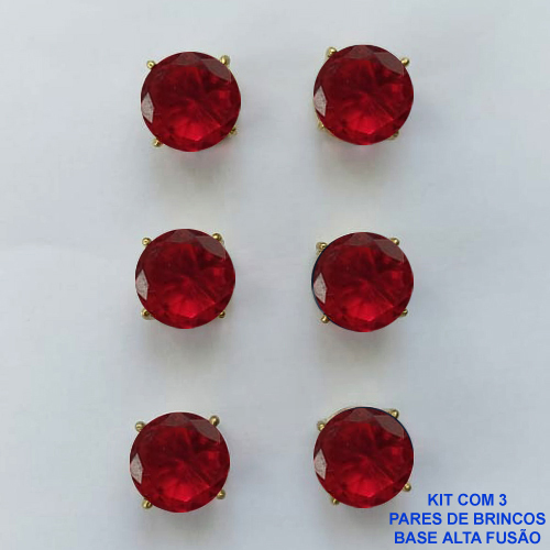 BRINCO NO BRUTO PRONTO PARA O BANHO - KIT COM 3 BRINCOS DE PINO COM ZIRCÔNIA VERMELHA REDONDA 10X10MM - PESO TOTAL 10,3GR - BRU15931