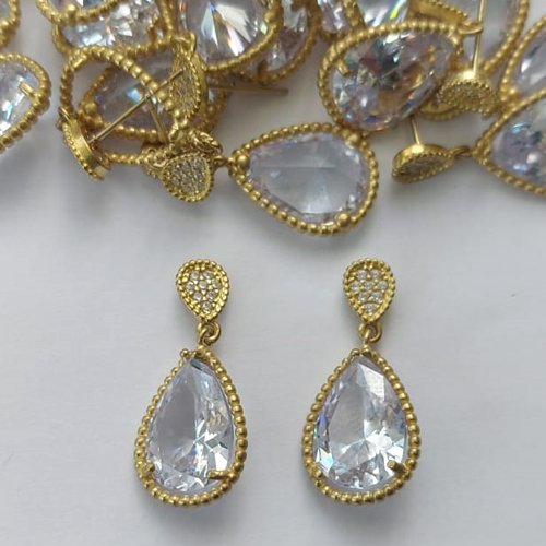 BRINCO NO BRUTO PRONTO PARA O BANHO - BRINCO DE PINO GOTA CRAVEJADO EM MICROS ZIRCÔNIAS 26MM - PESO: 4,2GR - COMPOSIÇÃO: LATÃO / ZIRCÔNIA - BRU15900
