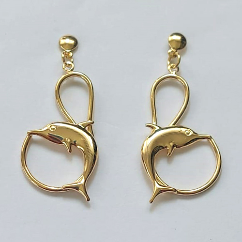 BRINCO FOLHEADO A OURO - BANHADO COM 5 MILÉSIMOS + VERNIZ DIAMOND - BRINCO DE PINO GOLFINHO VAZADO 16X27MM - OURO536