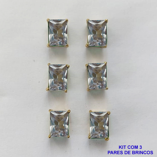BRINCO NO BRUTO PRONTO PARA O BANHO - KIT COM 3 BRINCOS DE PINO COM ZIRCÔNIA CRISTAL RETANGULAR 6x8MM - PESO TOTAL 4,3GR - BRU15755