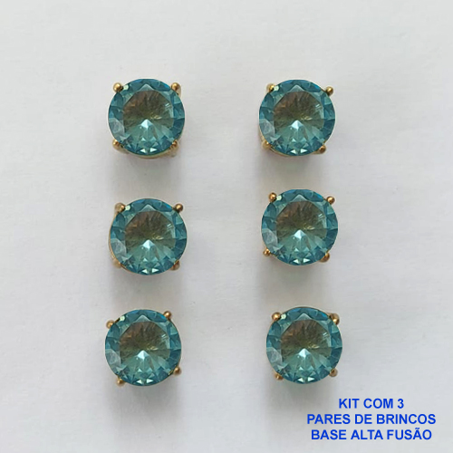 BRINCO NO BRUTO PRONTO PARA O BANHO - KIT COM 3 BRINCOS DE PINO COM BASE EM ALTA FUSÃO E COM ZIRCÔNIA AZUL REDONDA 8X8MM - PESO TOTAL 6,8GR - BRU15941