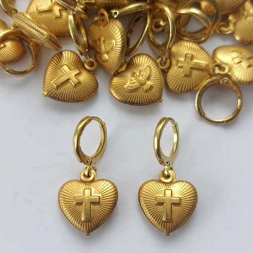 BRINCO NO BRUTO PRONTO PARA O BANHO - (E2548) BRINCO ARGOLINHA DE PRESSÃO COM PINGENTE CORAÇÃO DUPLO COM CRUCIFIXO 15MM - PESO: 2,5GR - COMPOSIÇÃO: 100% LATÃO - BRU15646