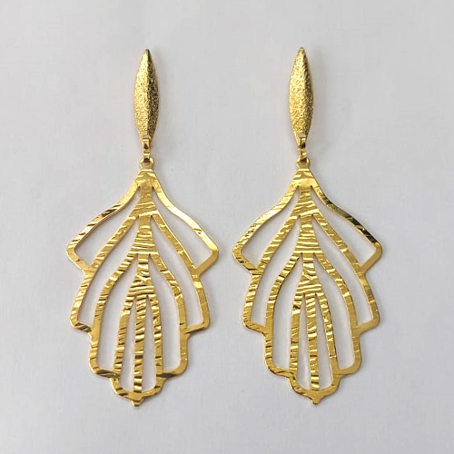 BRINCO FOLHEADO A OURO - BANHADO COM 5 MILÉSIMOS + VERNIZ DIAMOND - BRINCO DE PINO BASE OVAL COMPRIDA E PINGENTE DETALHES VAZADOS 30X52MM - OURO751