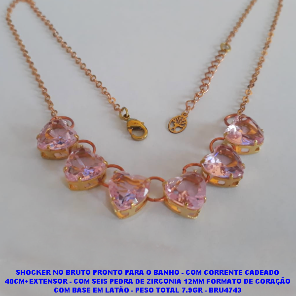 40CM+EXTENSOR - COM SEIS PEDRA DE ZIRCONIA 12MM FORMATO DE CORAÇÃO