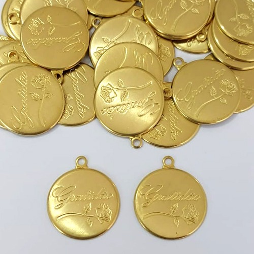 ACESSÓRIO NO BRUTO PRONTO PARA O BANHO - (924) PINGENTE REDONDO GRATIDÃO 25MM COM UMA ARGOLINHA - COMPOSIÇÃO: 100% LATÃO - PESO TOTAL 3,7GR - BRU24425