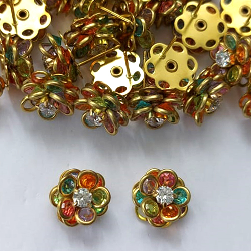 BRINCO NO BRUTO PRONTO PARA O BANHO - BRINCO DE PINO FLOR CRAVEJADA EM ZIRCÔNIAS COLORIDAS 12MM - PESO TOTAL 2,6GR - COMPOSIÇÃO: LATÃO / ZIRCÔNIA - BRU16130