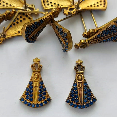 BRINCO NO BRUTO PRONTO PARA O BANHO - BRINCO DE PINO NOSSA SRA APARECIDA CRAVEJADA EM MICROS ZIRCÔNIAS AZUIS 17MM - PESO: 1,6GR - COMPOSIÇÃO: LATÃO / ZIRCÔNIA - BRU15637
