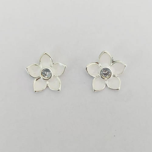 BRINCO FOLHEADO A PRATA COM 50 MILÉSIMOS + VERNIZ DIAMOND - BRINCO DE PINO FLOR COM ZIRCÔNIA ESMALTADA BRANCA 15MM PRA816